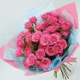 Букет из кустовой пионовидной розы и хамелациума "мулен руж"