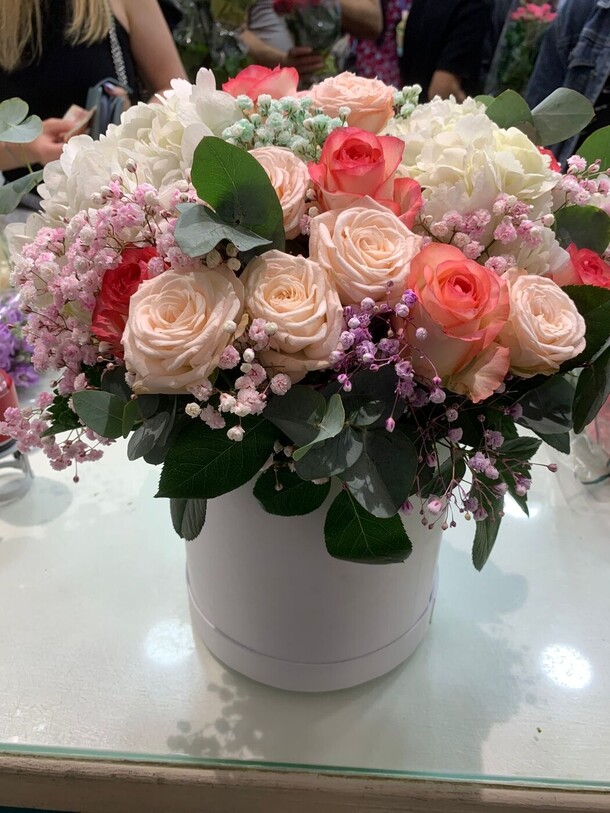+Букет красивый, цветы свежие. Доставка вовремя. -Фото букета прислали уже после того, как его доставили. Не было инструкции по уходу букета в коробке. Утром полила букет в центр. Вся коробка пропиталась влагой, видимо неправильная упаковка внутри коробки. Очень печально. Боюсь к концу дня коробка совсем размякнет и развалится.