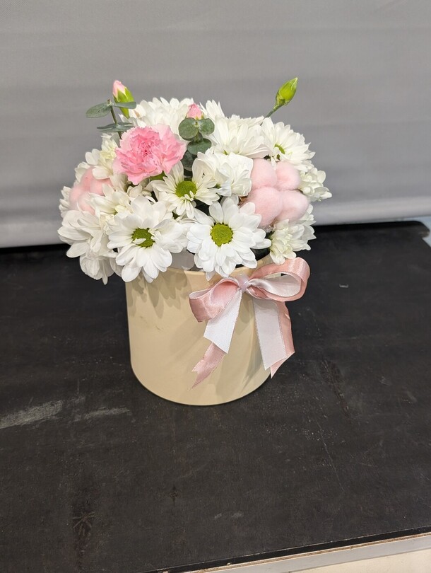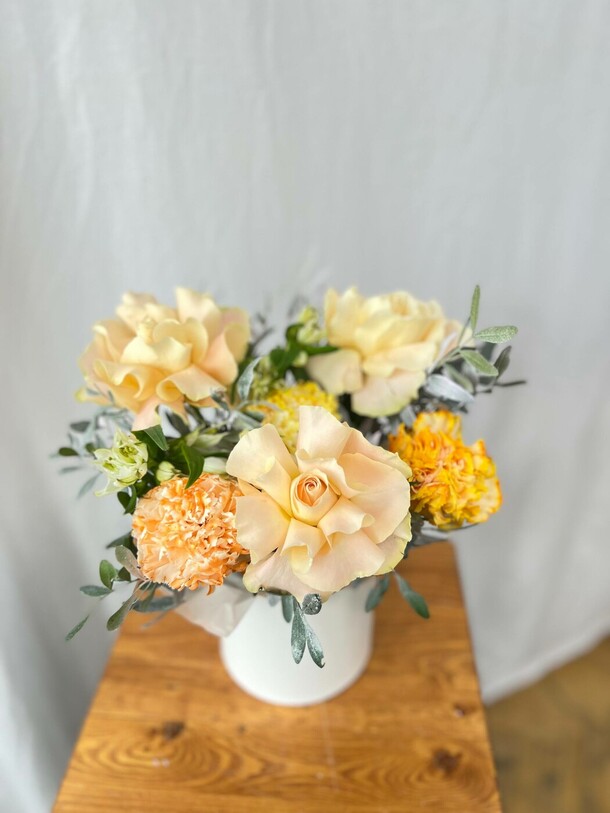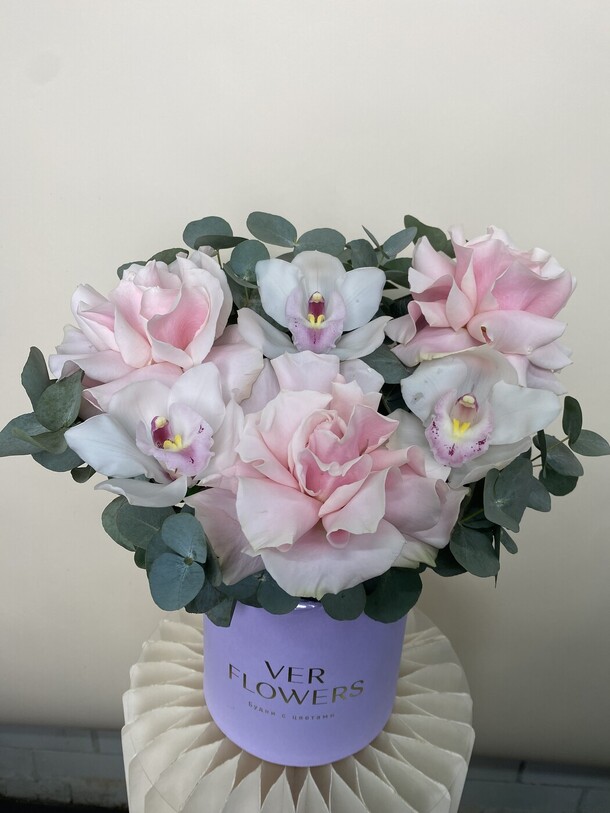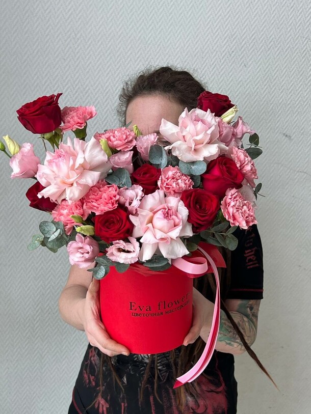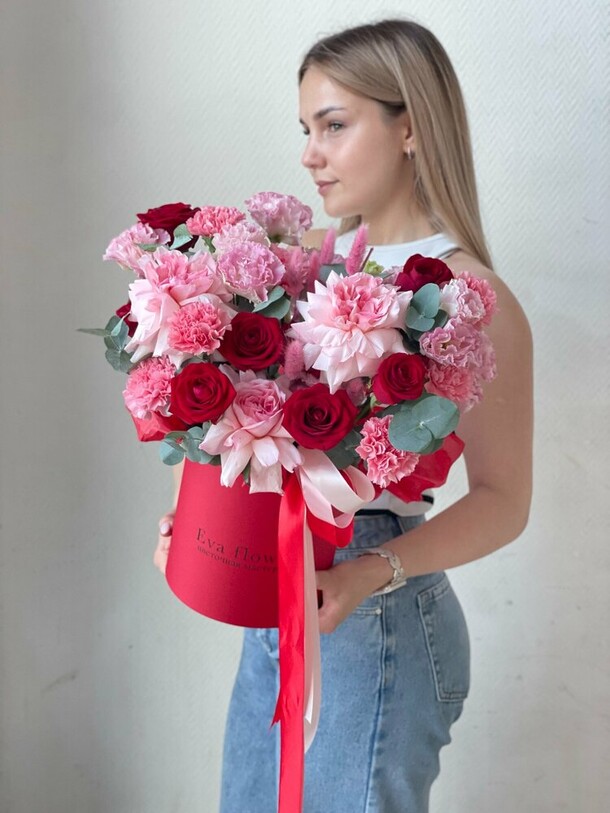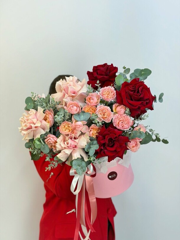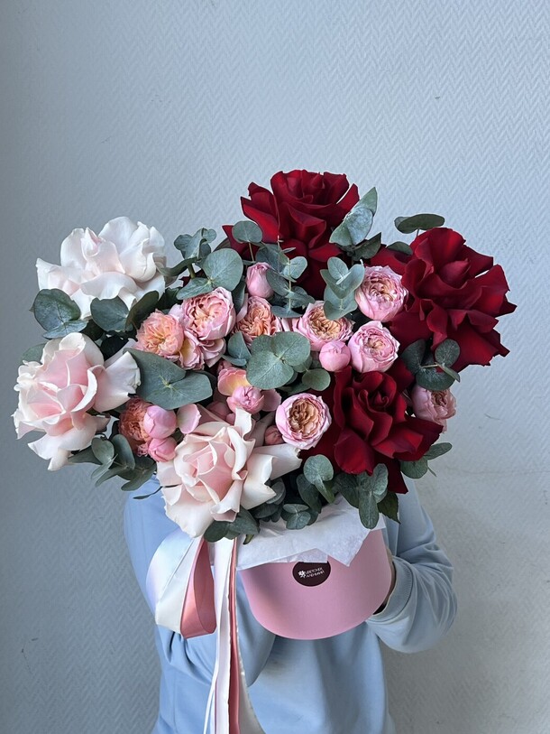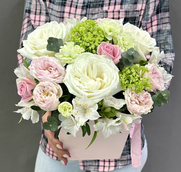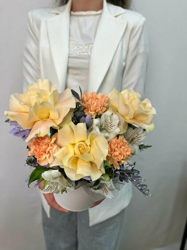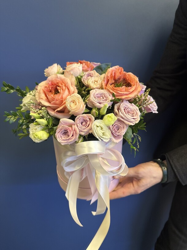 1. Букет не в нежной цветовой гамме, как в карточке товара. Цветы более яркие, а коробка вместо пастельной тёмная.