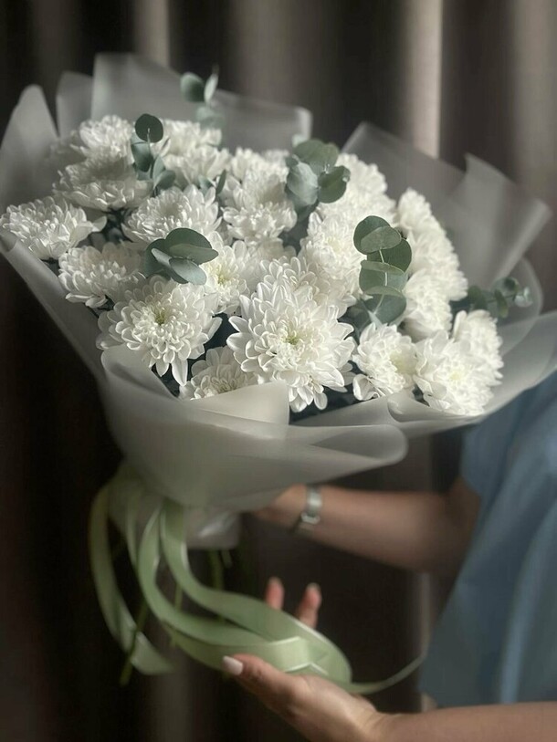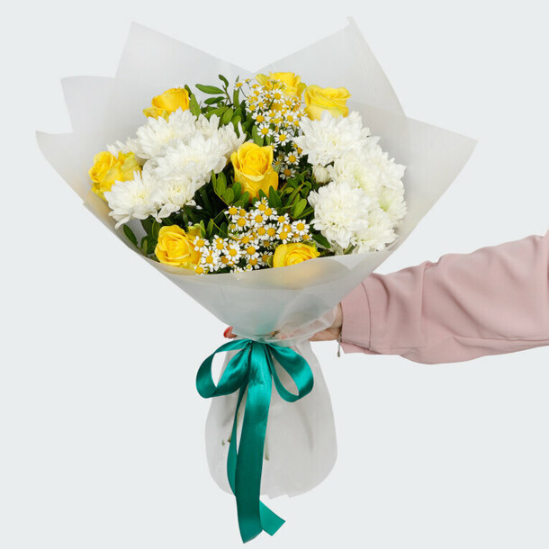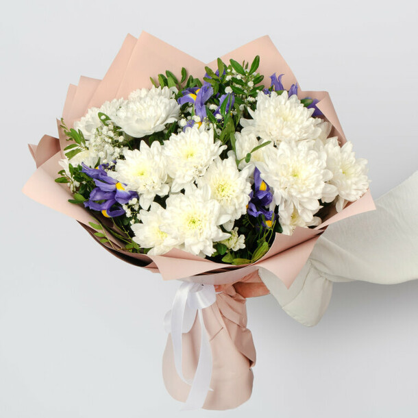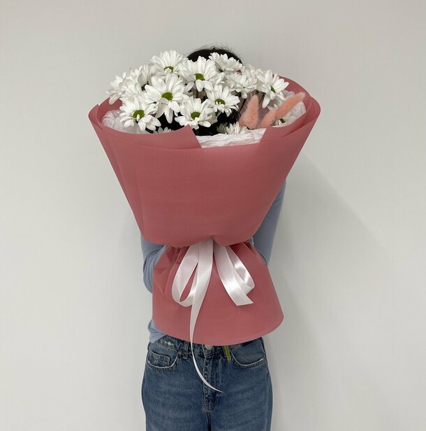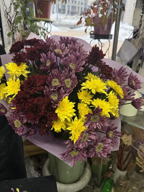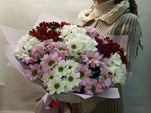 Букет цветов в целом совпадает с фото, но пришёл немного помятым и придавленным. Сами цветы хорошего качества, пушистые, яркие, не опадают. Доставка задержалась не несколько часов, но учитывая праздничный-выходной день, это было предсказуемо
