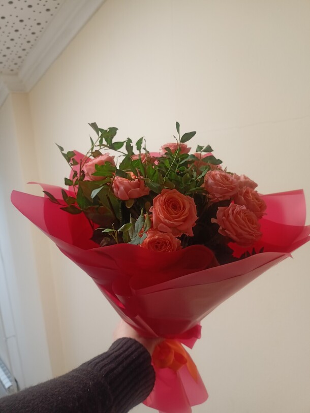Отличные свежайшие цветы, стояли и радовали целую неделю. Минус за доставку. Почему то привезли не в квартиру, а к подъезду, пришлось выйти забрать заказ. Хотя полный адрес был прописан