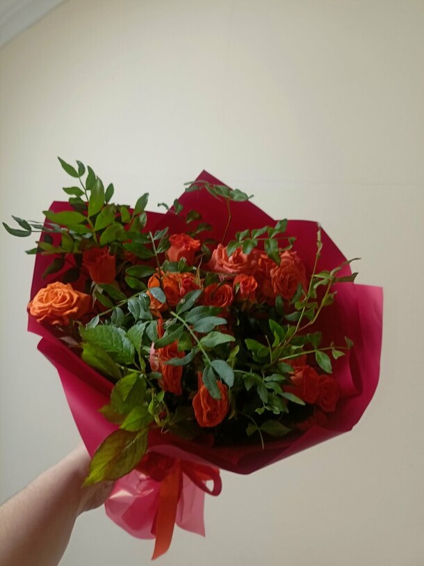Классный букет, розы свежие и пышные, яркого насыщенного цвета, всё качественно и аккуратно упаковано, в конверте шоколадка — приятно)) И доставили без опозданий. Спасибо! 🧡