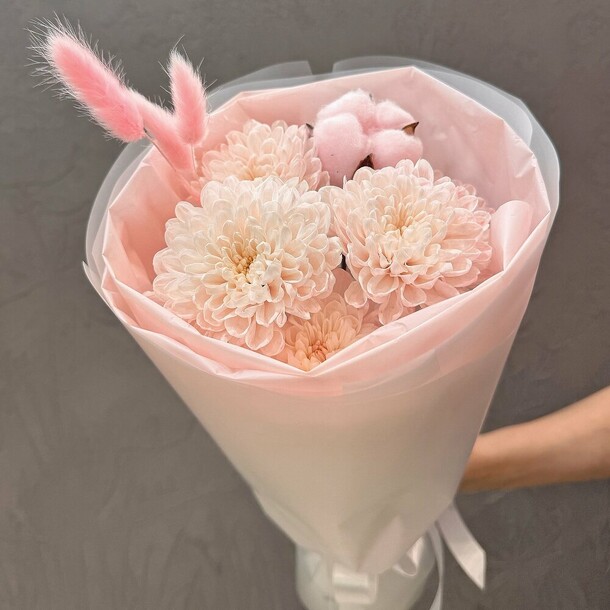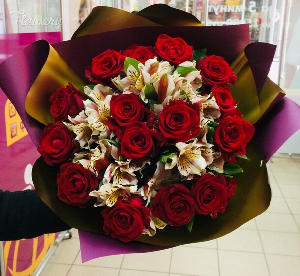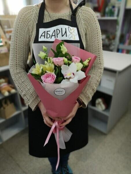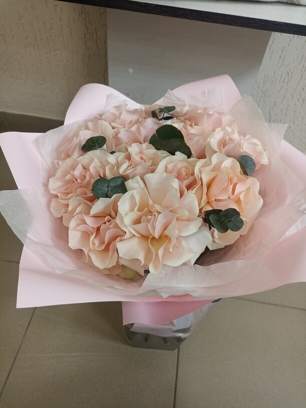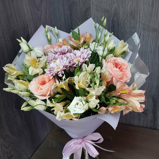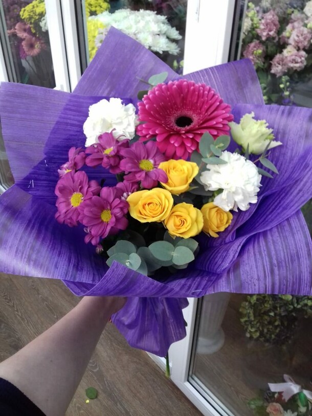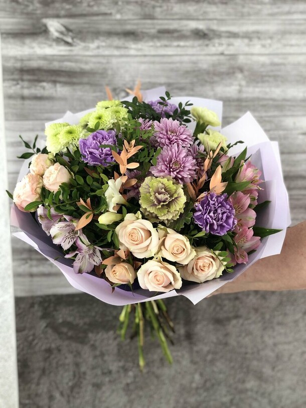 Букет красивый, работа сделана качественно, видно мастерство флориста, за что отдельная благодарность. Цветы свежие, доставка была к необходимому времени, все отлично!