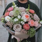 Авторский букет из кустовых и пионовидных роз с хризантемой и лизиантусом "магия загадочного поместья"