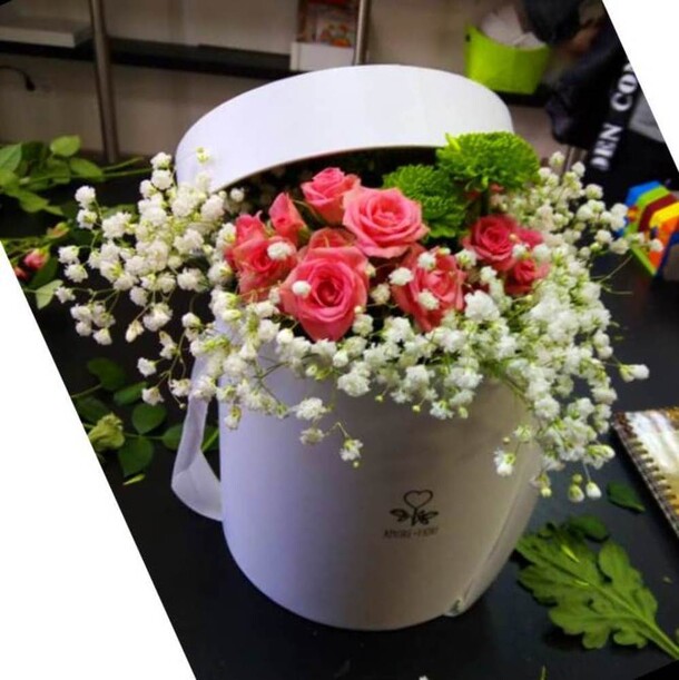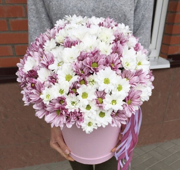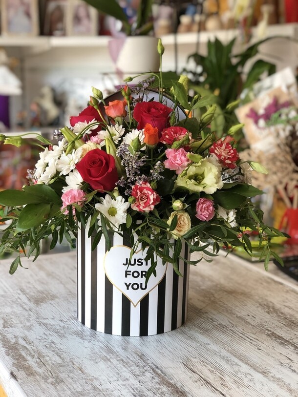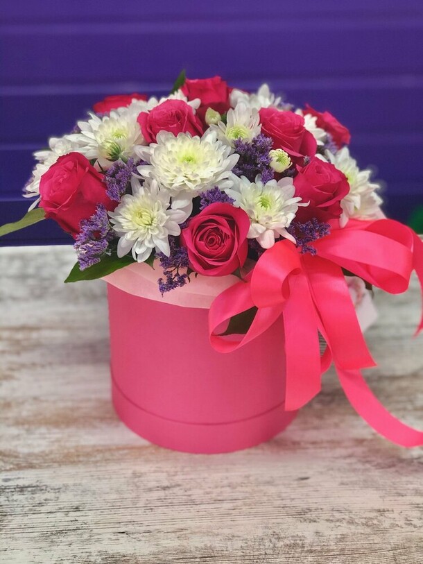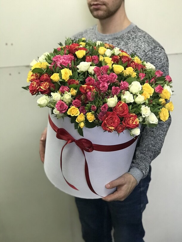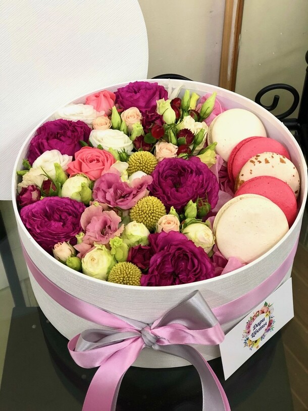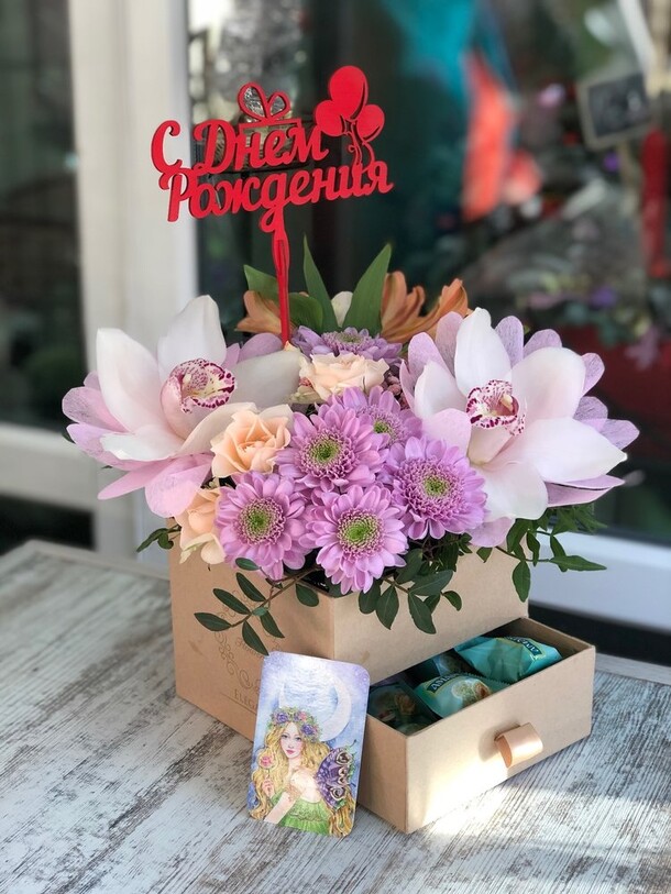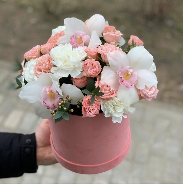 Очень красивый, нежный и стильный букет в шляпной коробочке, по просьбе положили доп открыточку с Днём рождения! Доставили вовремя) Спасибо большое!!!
