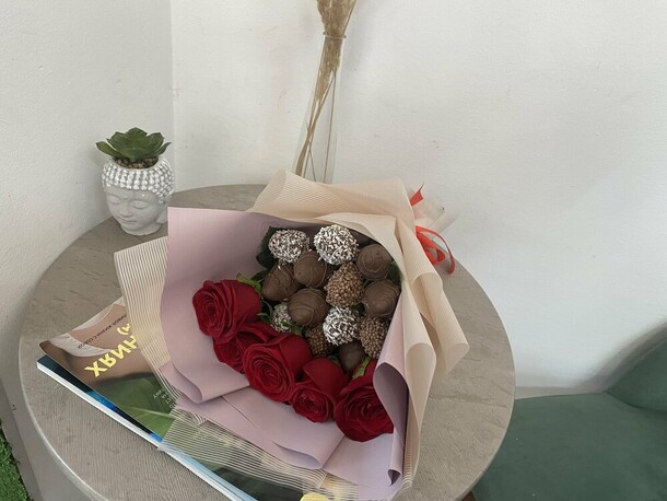 Букет отличный- держится крепко, довезли в соседний город. Фрукты мягкие, свежие, ягодка к ягодке, как говорится!