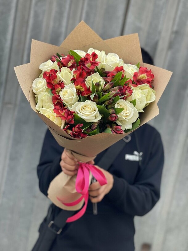 Курьер приехал во время, букет очень красивый , дешевле такую красоту нигде не найдёте , самому очень понравился