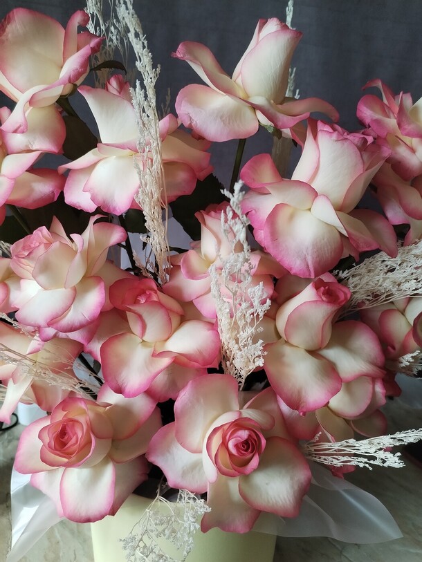 К сожалению, часть цветов 50/50 далеко не свежие, уже появились коричневые подсохшие края. Плюс доставка заявлена с 14:00 до 15:00, привезли около 17:00. Хорошо, что перепутала дату, просто оставила себе.