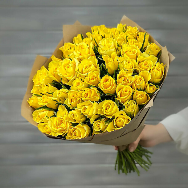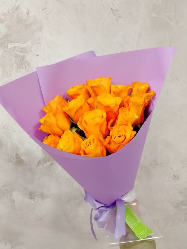 Получила букет не такой эффектный, как на фото. Хотелось именно желтые розы, а вместо них использовали оранжевые, которые слились с упаковкой 😕