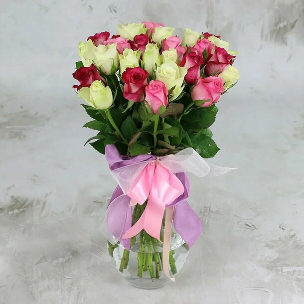 Букет гораздо меньше, чем на фото, при этом плотно связаны цветы. В вазе развязали, смотрелось гораздо лучше.