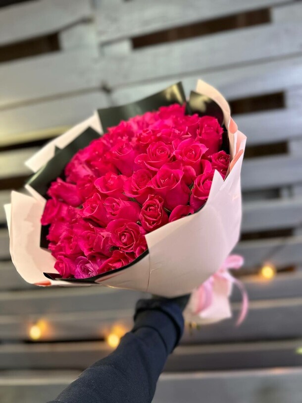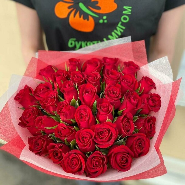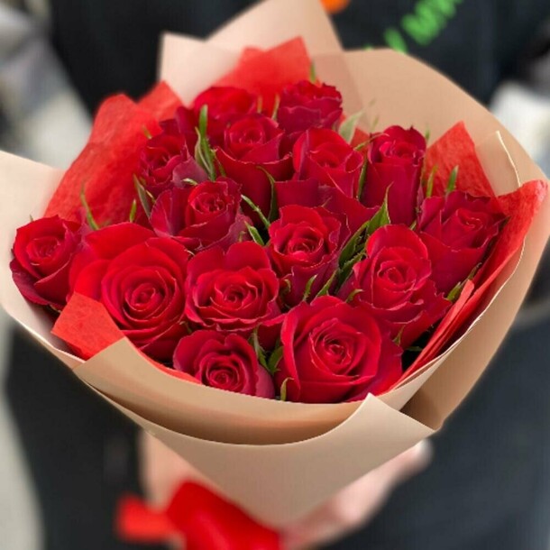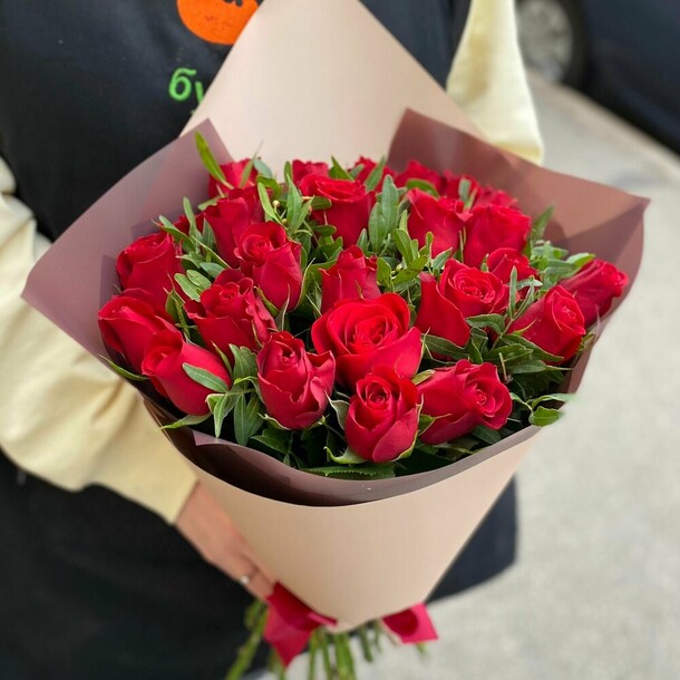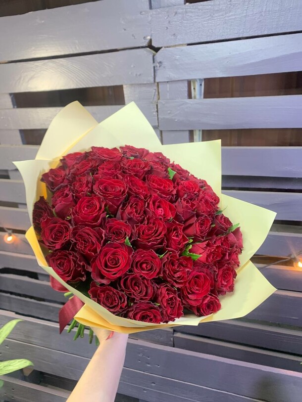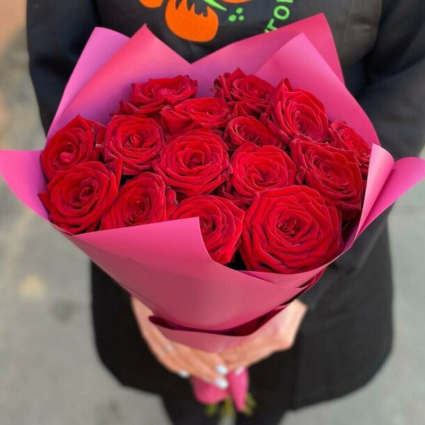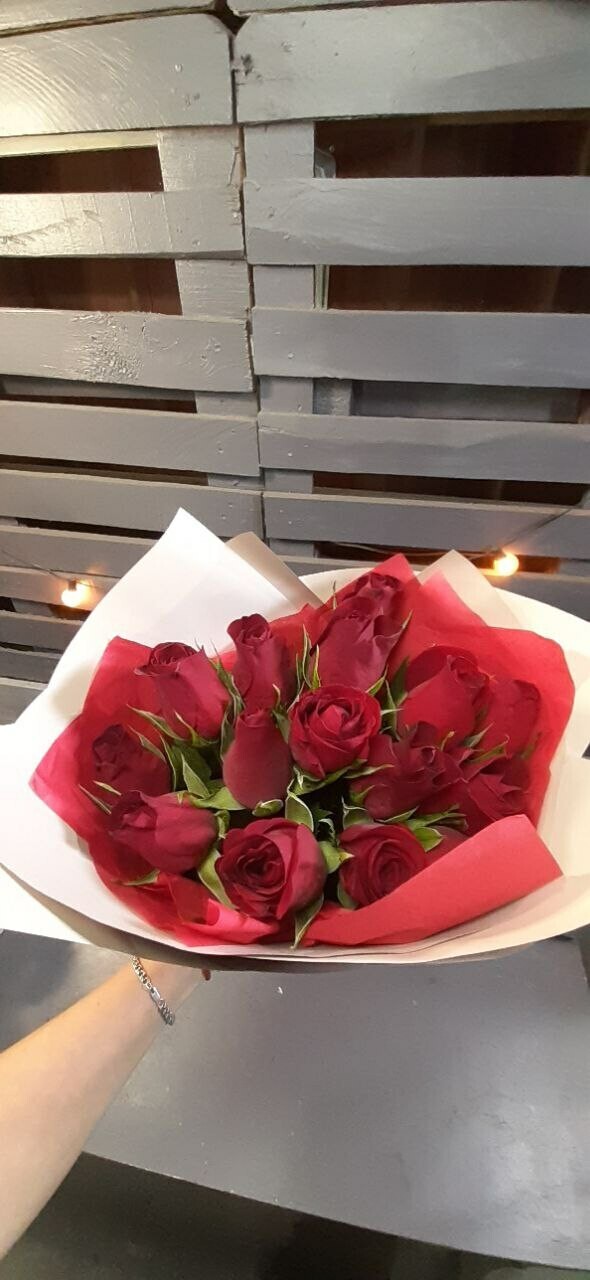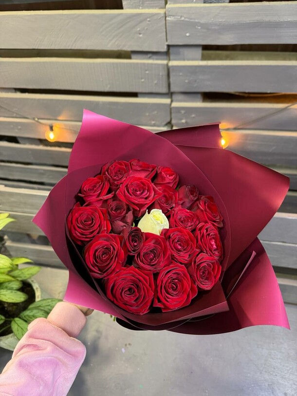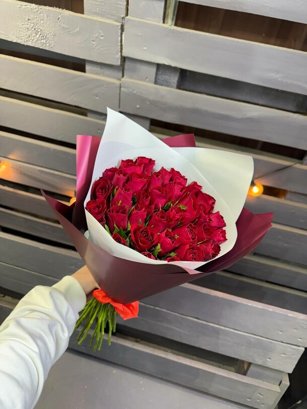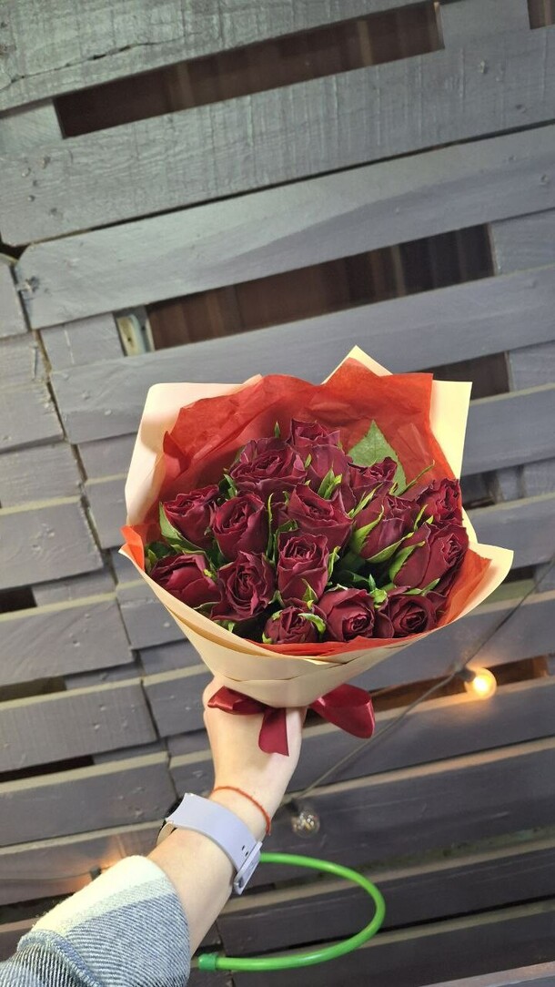 1)букет чуть не доставили на день раньше. пришлось звонить и еще раз проговаривать дату доставки. на предварительном фото (перед отправкой на день раньше) были ярко-красные розы, никак не бордовые, как на заявленном фото.