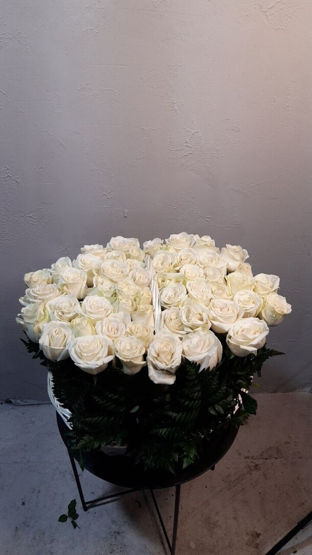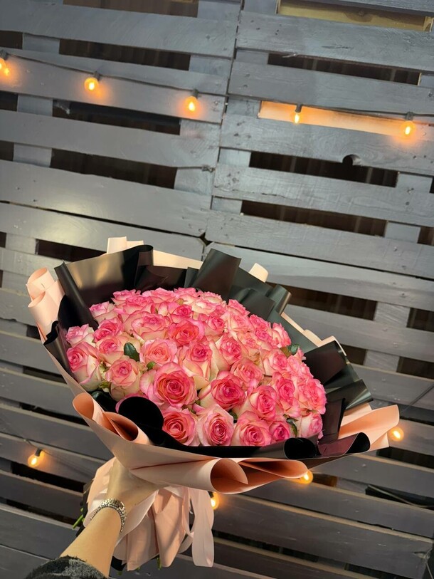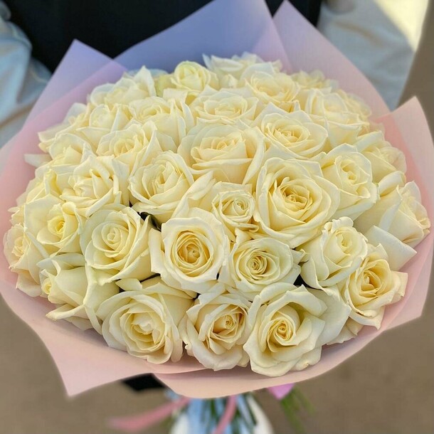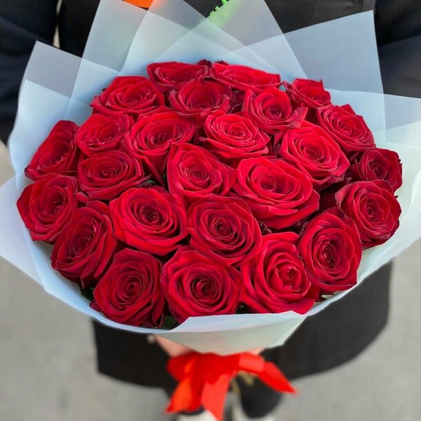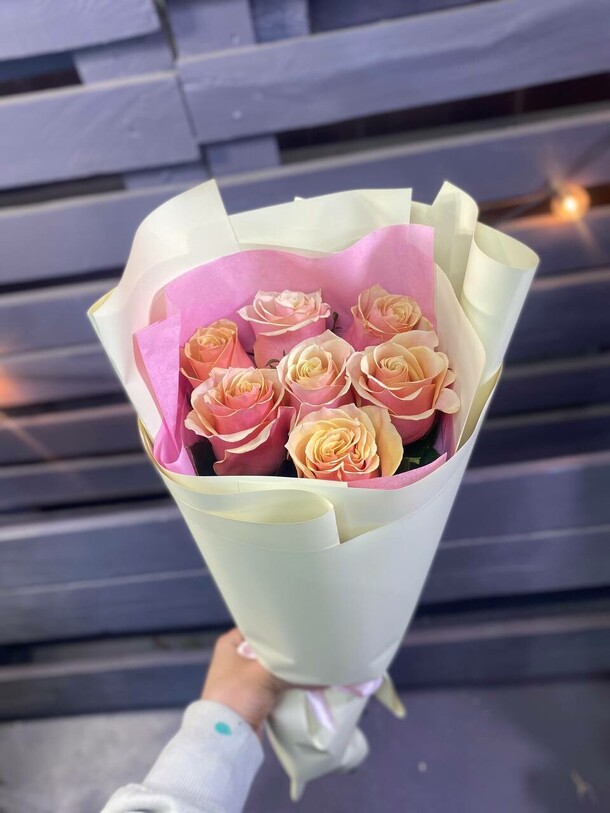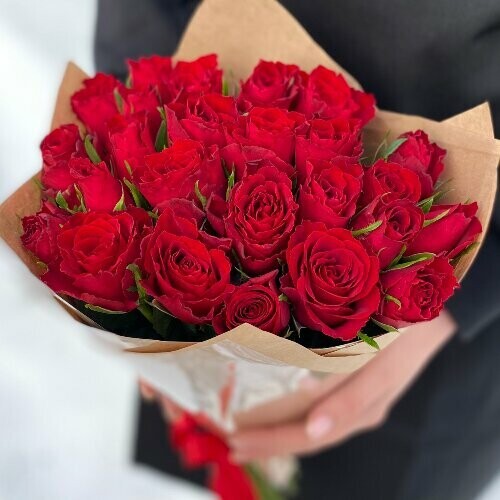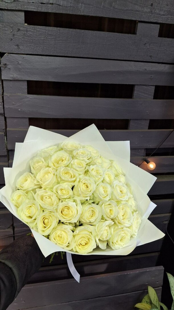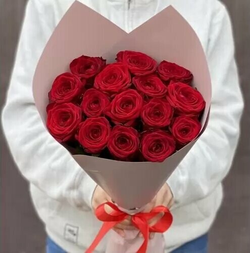 Красивый свежий букет. Удобный сервис. На фото немного пышнее и не совпал цвет роз.
