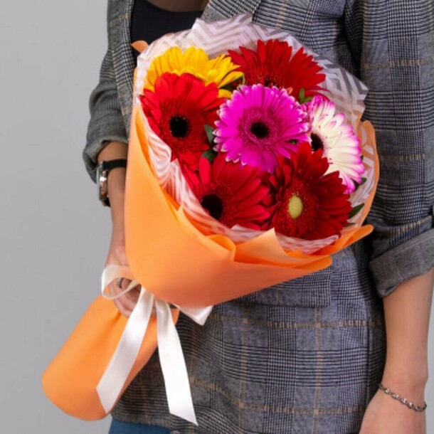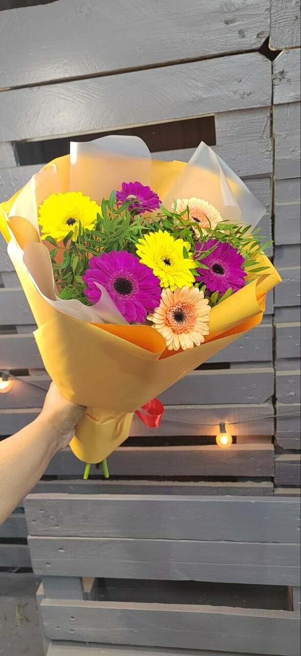 На фото и по факту разное. Герберы маленькие. Букет не такой плотный как на фото + зелень добавили. Классическое "ожидание/реальность".