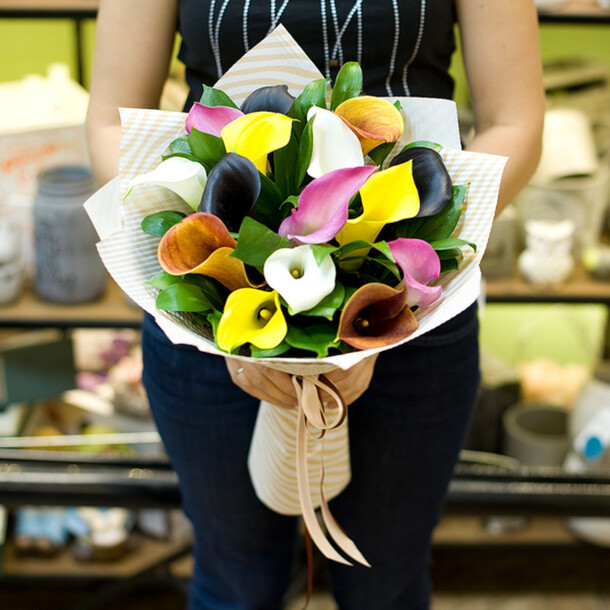 На фото изображен очень красивый и органичный букетик, по количеству цветов и зелени. Сейчас уже понимаем, что букет на фото и в реальности, это два разных букета, потому что на фото 15 цветков, а в жизни 9, из которых два калла уже увядают, а один в стебле посередине раздавлен, ну и все это в изобилии зелени.