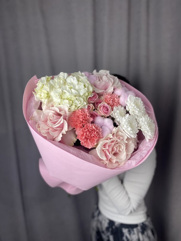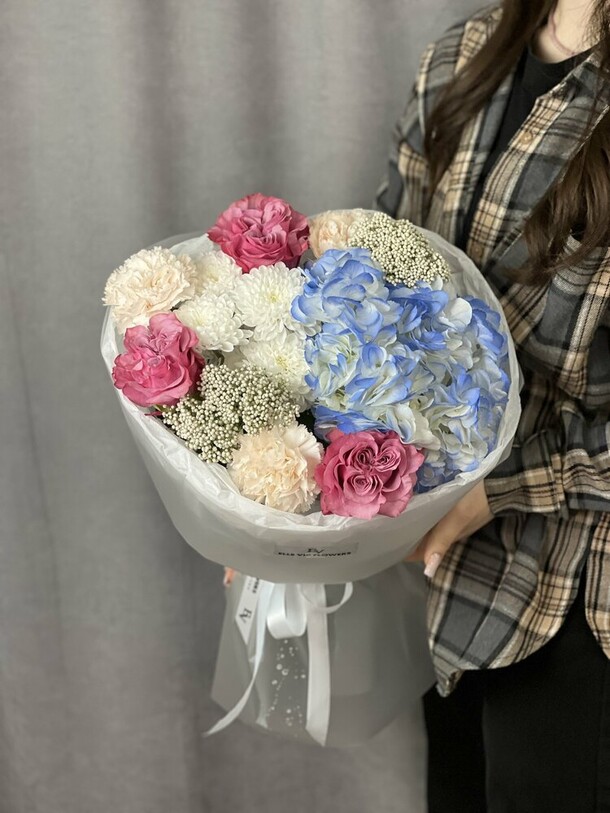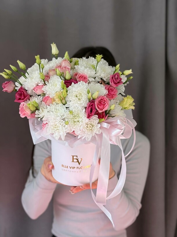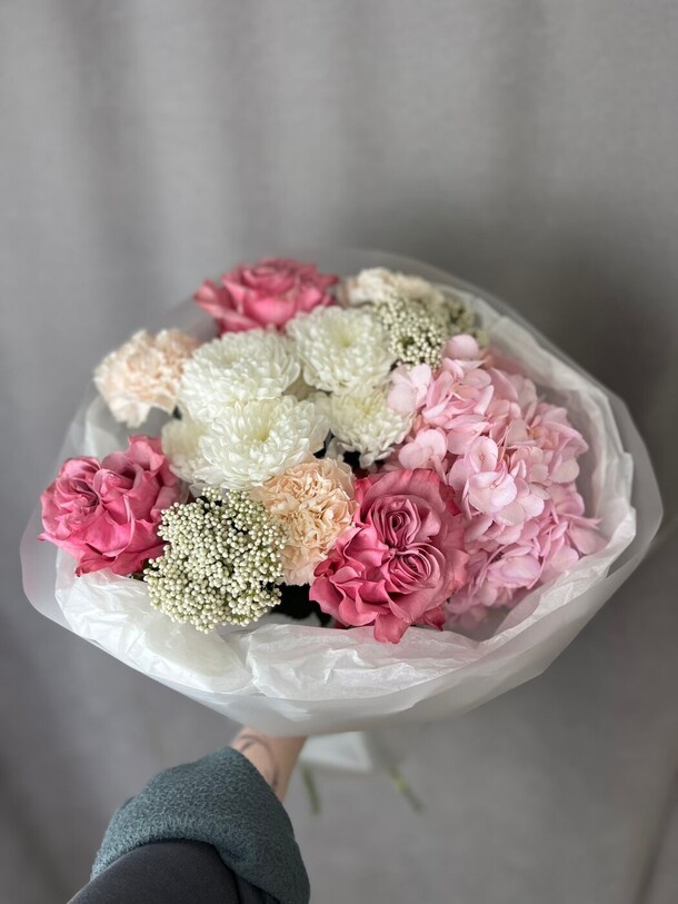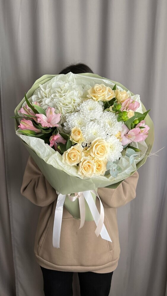Букет был не круглой формы а овальной, хризантемы располагались кучей по середине что создавало не очень привлекательный вид. Благо есть опыт работы флористом и заказ оформила заблаговременно, переделала его сама.