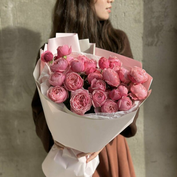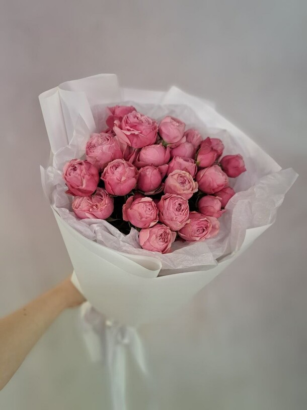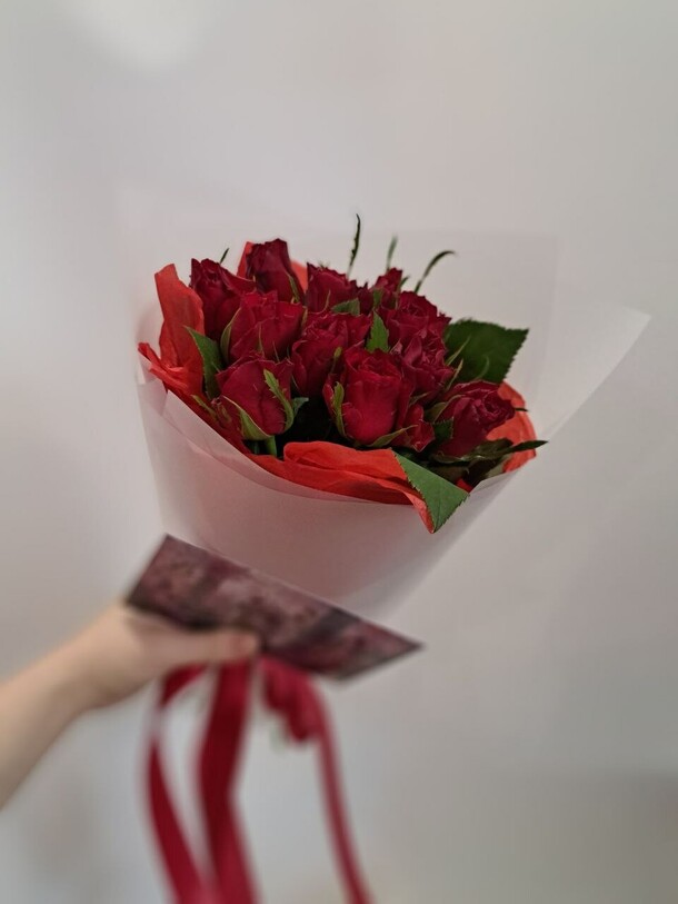 На фотографии с примером розочки гораздо пышнее, чем привезли фактически. Более менее пышных только 3 розы в букете, остальные все «худенькие» бутончики, из-за этого букет смотрится жидко. Видимо решили компенсировать это жирно намотанной упаковкой. Фотографию прислали с такого ракурса, где не видно пышность роз.