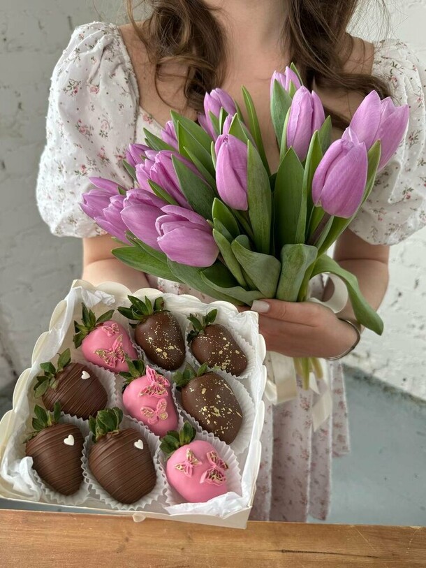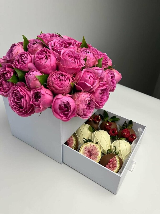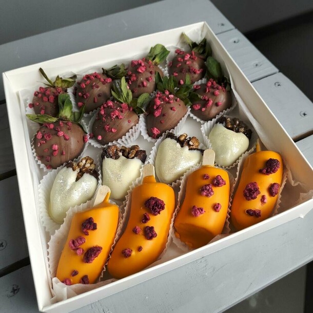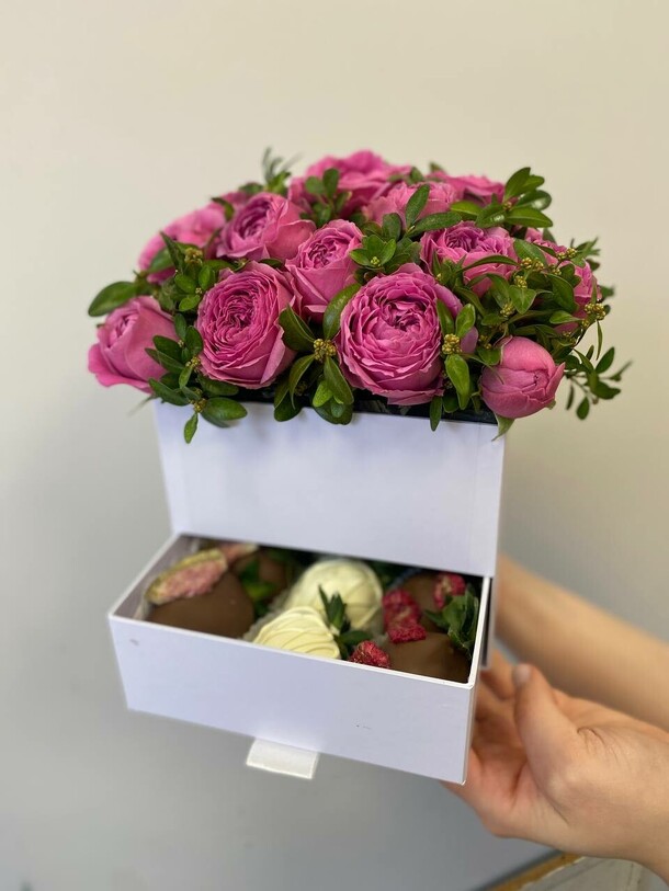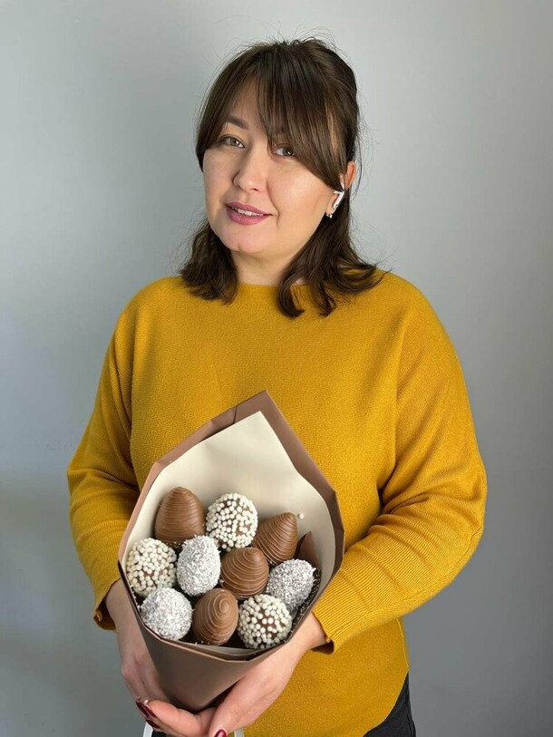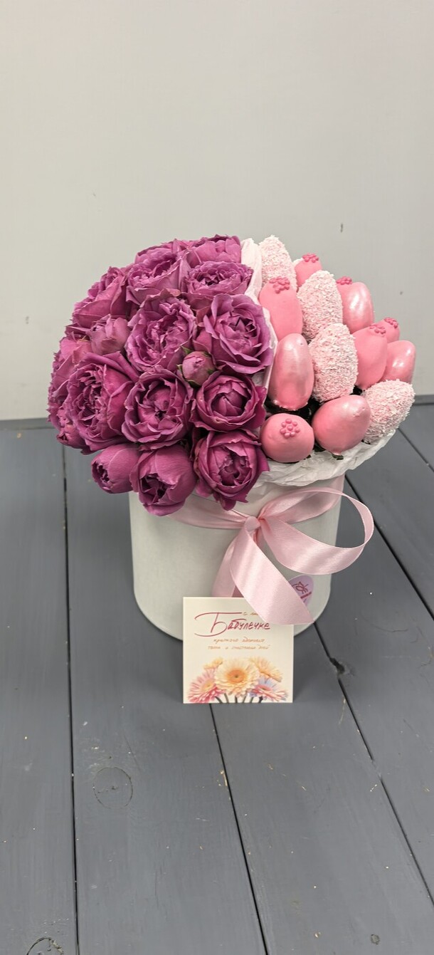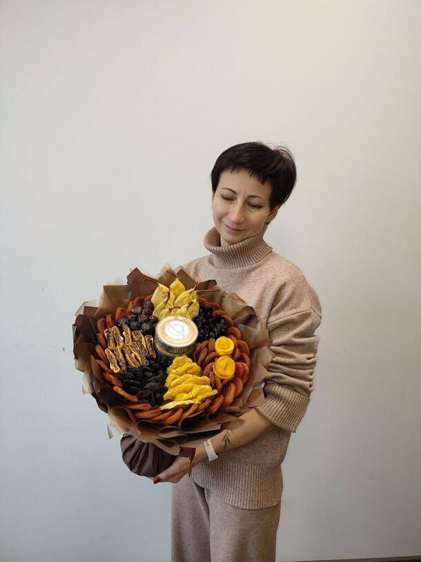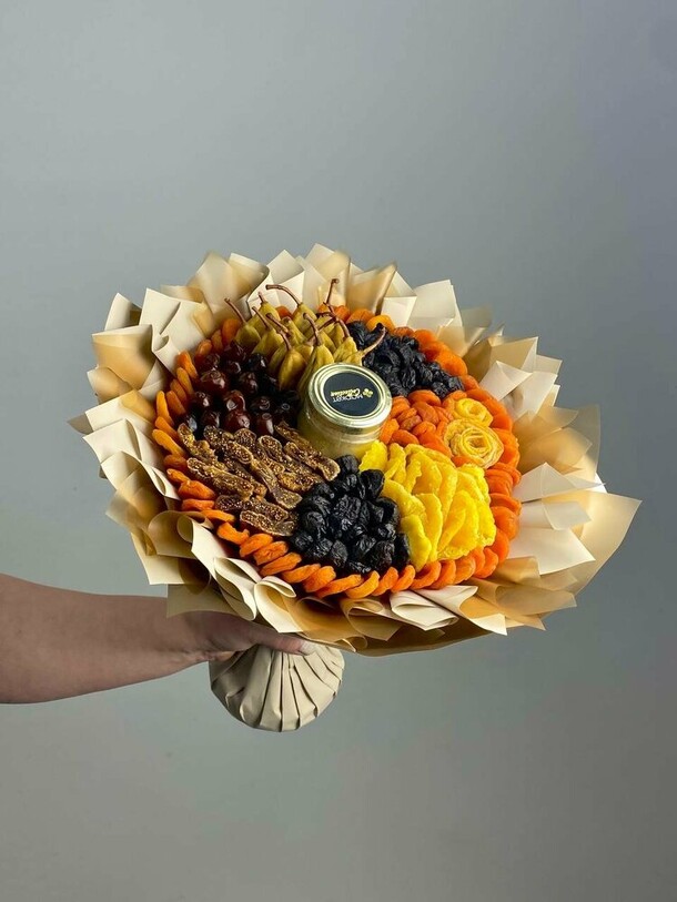 Букет отличный- держится крепко, довезли в соседний город. Фрукты мягкие, свежие, ягодка к ягодке, как говорится!
