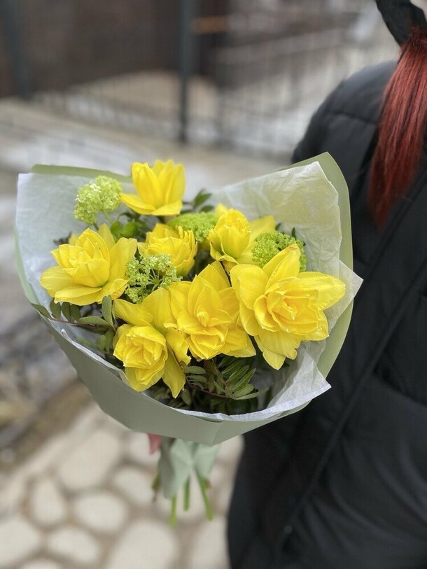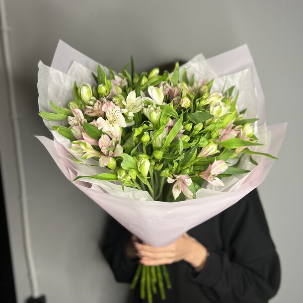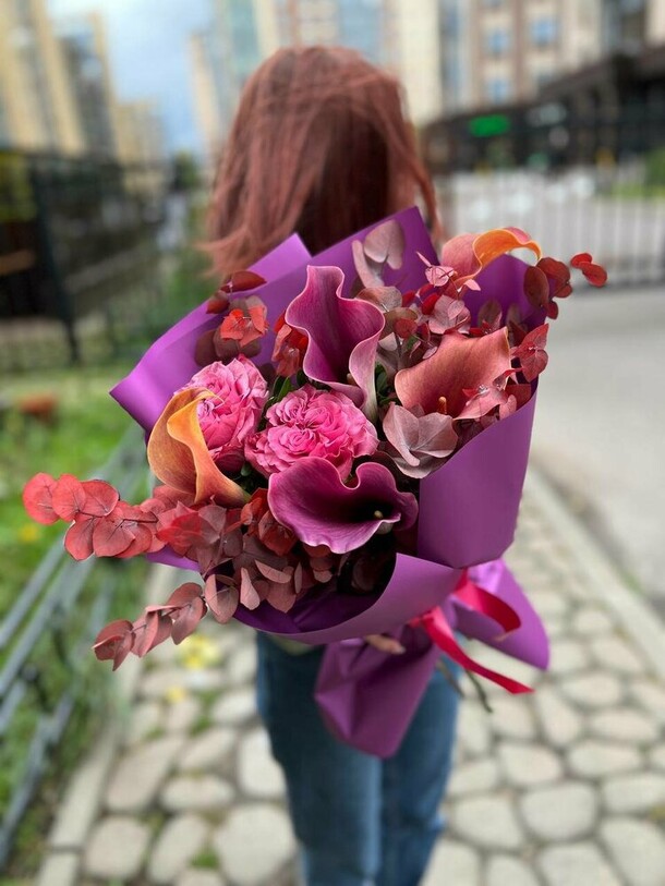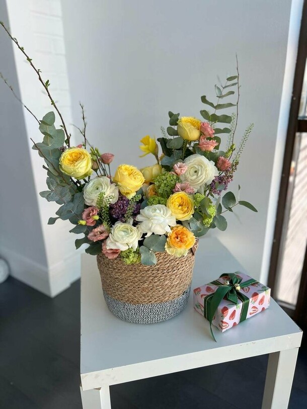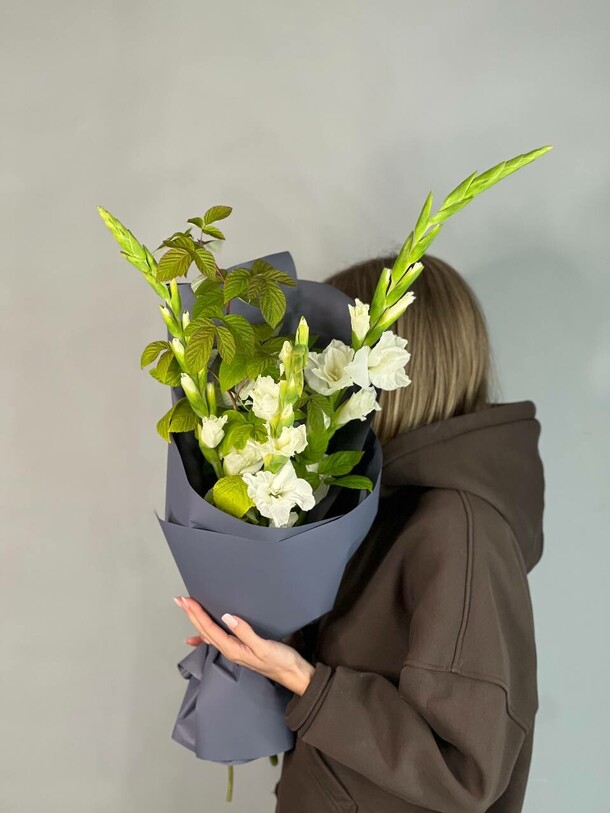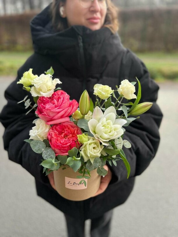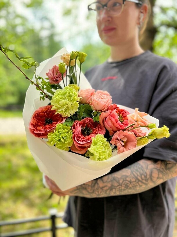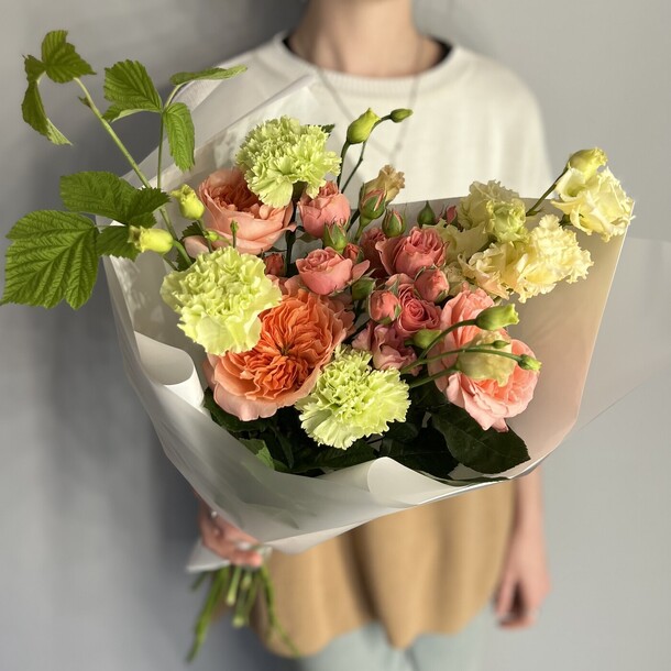Композиция очень свежая, гармоничная, отлично собрана и упакована. Своевременная доставка, сотрудники салона всегда на связи, компетентны, доброжелательны!