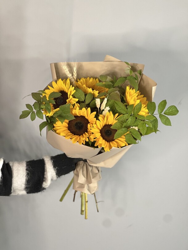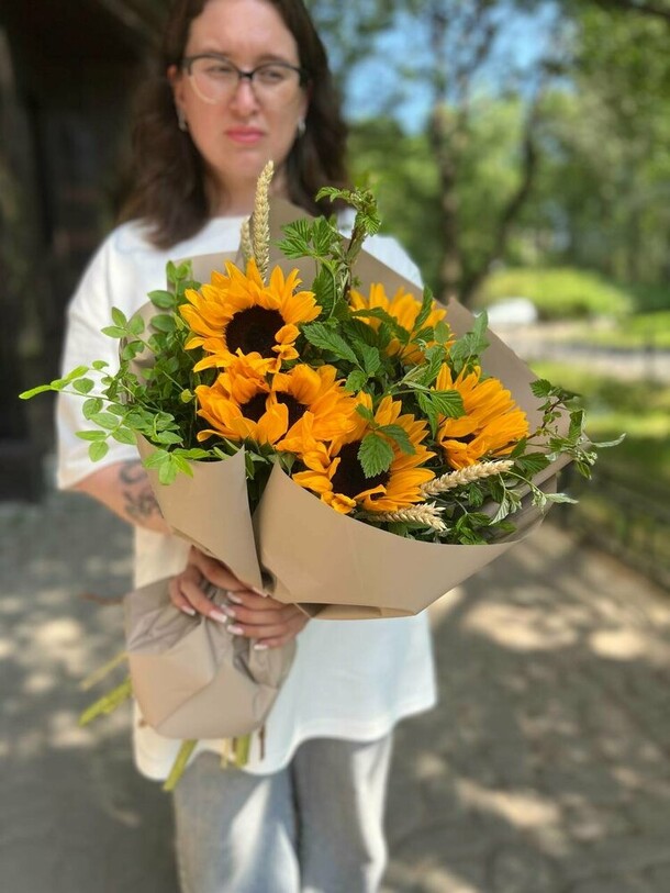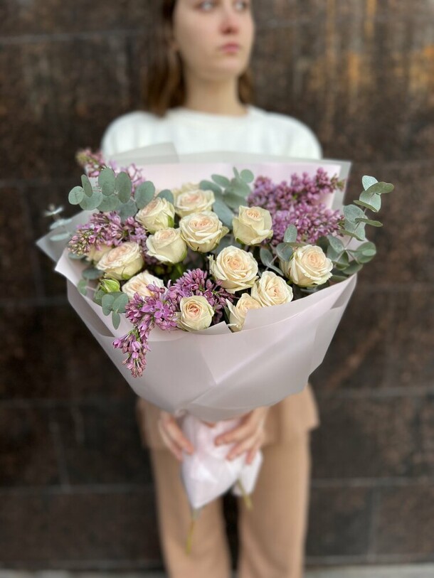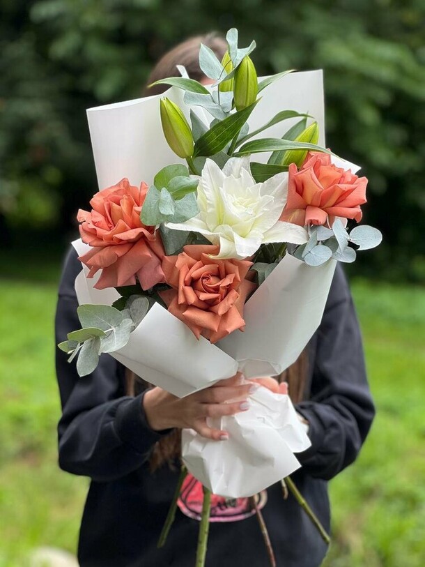 Девушке понравился, на мой взгляд кустовые розы вялые. Поставили в воду может быть отойдут. Хотелось бы к букету инструкцию по уходу