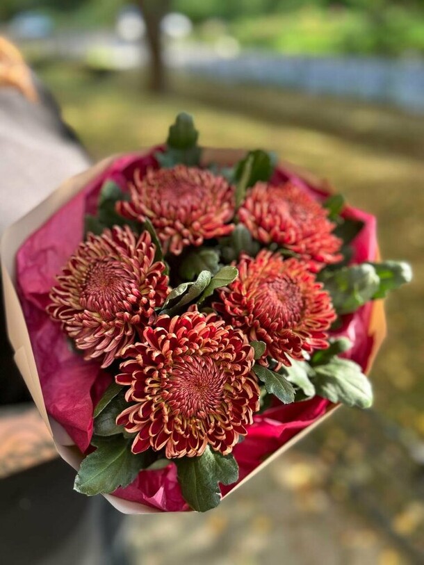 Интересное сочетание цветов в букете, что выгодно отличает этот букет от многих других. Удобно и ненавязчиво поддерживали связь в приложении. Помимо открытки с моим текстом по моей просьбе, вдруг добавили ещё средства по уходу за цветами и большую картонную упаковку для транспортировки.