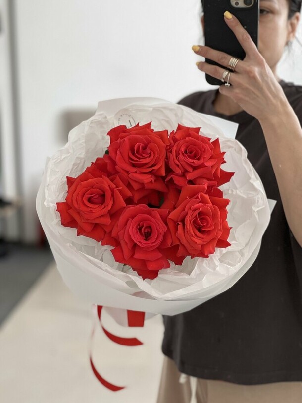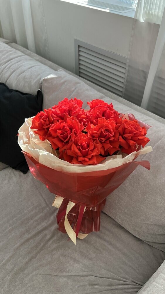 На фото, что прислал салон, букет очень даже симпатичный. Но вот по факту доставки видно, что бутоны заветренные и вялые. И один бутон отличается по цвету от остальных. То есть фото специально были сделаны так, чтобы скрыть недостатки букета. Разочарован, так как это букет на день рождение близкого человека.