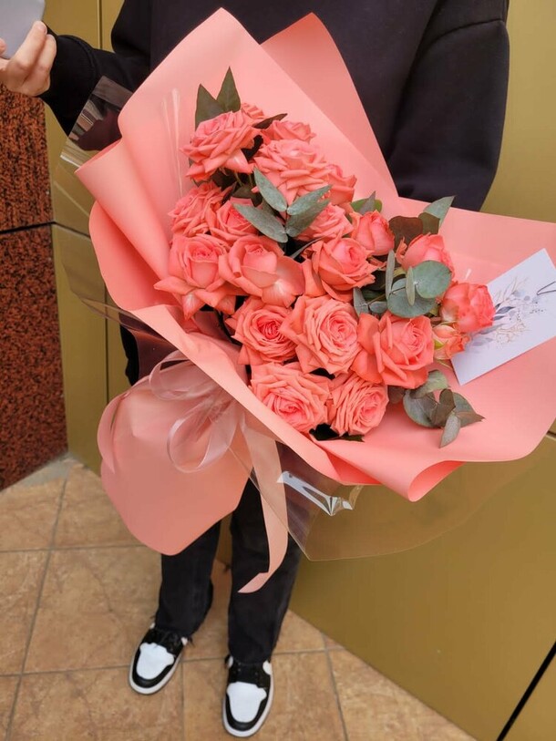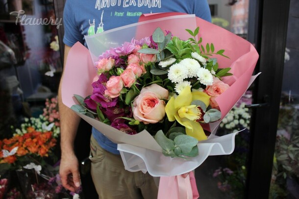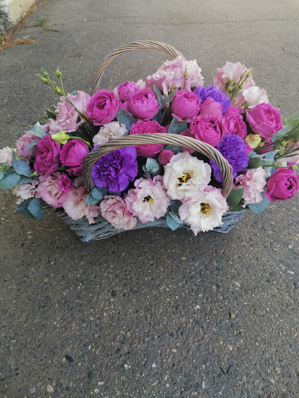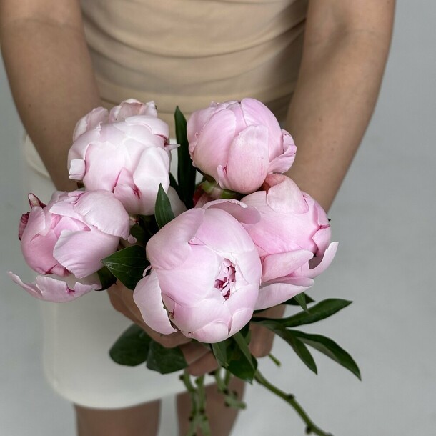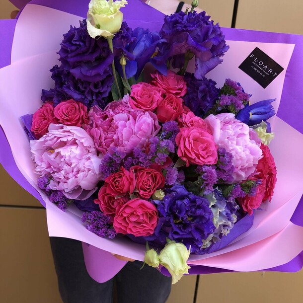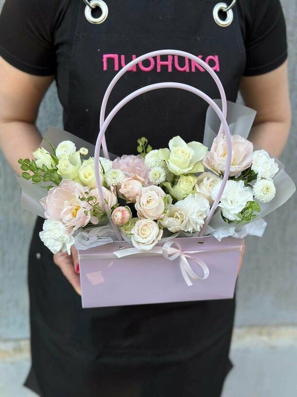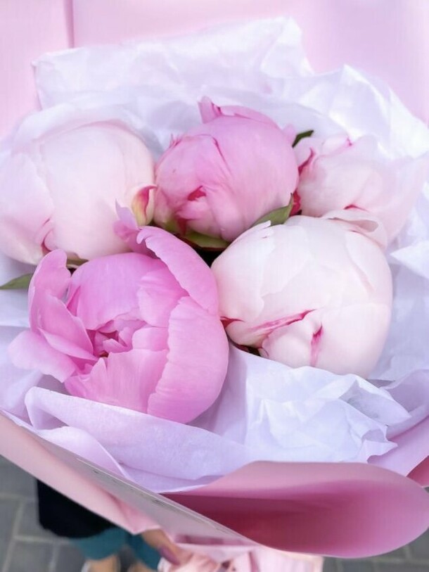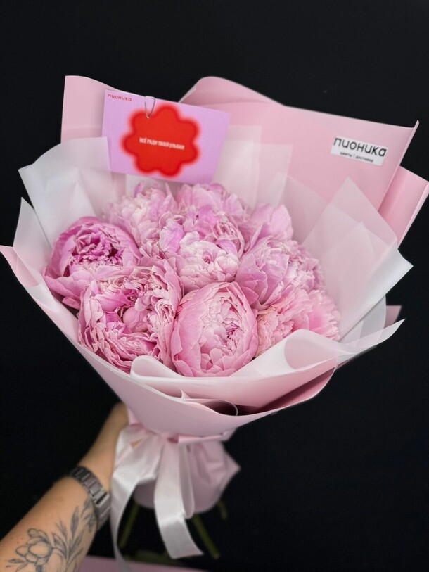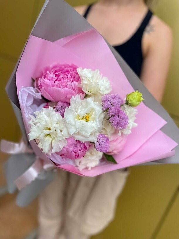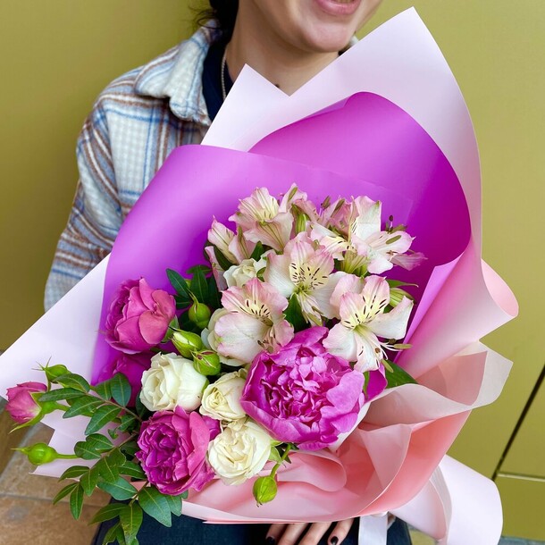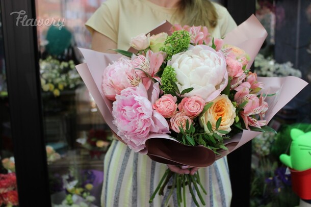 Пионов не было, заменили розами, но выглядит шикарно, собрали быстро, доставили в срок