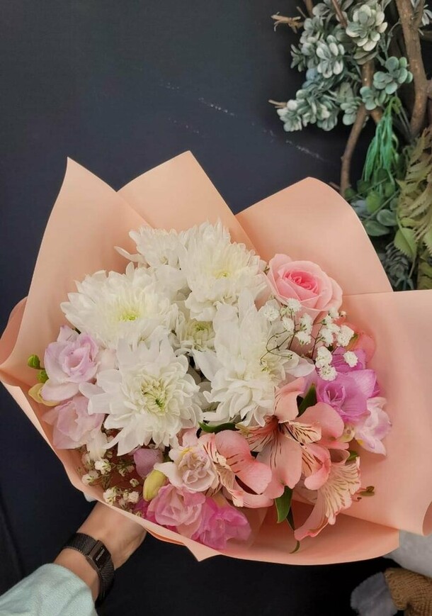 Сервис на высшем уровне. Букет получился даже лучше, чем на картинке. Нежный, красивый. Из салона звонят, помимо сообщений в чате приложения. Девушка очень милая в общении. Фото букета до доставки прислали. Упаковали дополнительно в крафт бумагу, т.к. было морозно сегодня. В 9:59 букет вручили имениннице. Заказ делала из Санкт-Петербурга и всё так чётко прошло. Спасибо вам ещё раз огромное! Процветания🤗🌸 Буду заказывать теперь у вас при случае💫