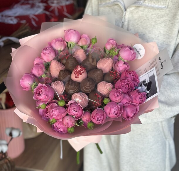 Флористы мастера своего дела, букет сделали на отлично! Магазину 5+, вот доставка подкачала, а точнее курьер, позвонил не по теоефону, а через воцап, торопил и просил скинуть локацию, его попросили подождать 10 минут, а ему некогда. В общем настроение подпорчено, да ещё в такой праздник. Совет тем, кто будет заказывать: лучше без сюрпризов и предупреждайте своих избранниц, чтобы в назначенное время ждали звонка и подарок.