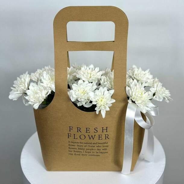 Букет приехал уже в не самом презентабельном виде (было 2 уже умирающих цветка + один цветок был сильно короче других и прятался где-то внутри), в 7 вечера (доставка была в 10 утра этого же дня) цветы завяли, хотя весь день были в холодной воде и в прохладе. В целом букет как будто неравномерно был распределен внутри бумаги