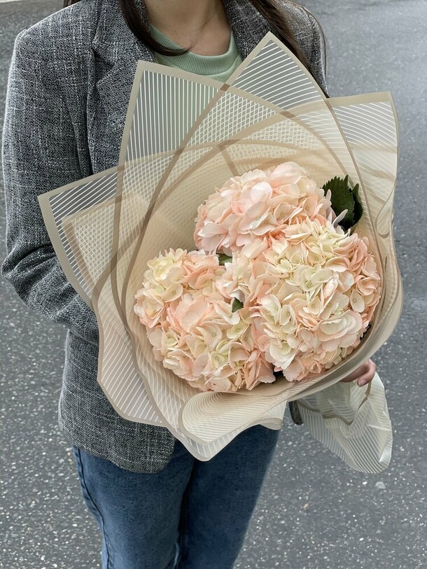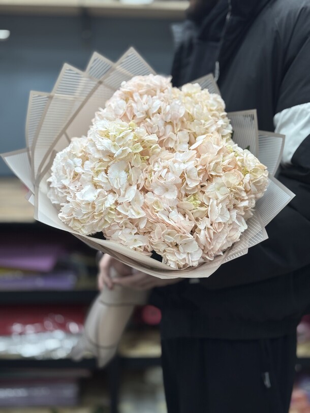 Букет собрали быстро, доставили четко. Очень красивый цвет гортензий, лучше, чем на фото. Шапки цветов большие, пушистые. Стебель каждого цветка в мешочке. Флорист в чате быстро и четко ответила на вопрос , как ухаживать. Спасибо !!!