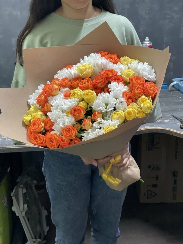 Цветы приехали мягко говоря не первой свежести, на фотографии букет выглядит совершенно другим. Для объема судя по всему в букете бумага, но как его в таком виде дарить? Это совершенно не эстетично, за 6к хотелось бы получить свежие цветы и хорошую упаковку!