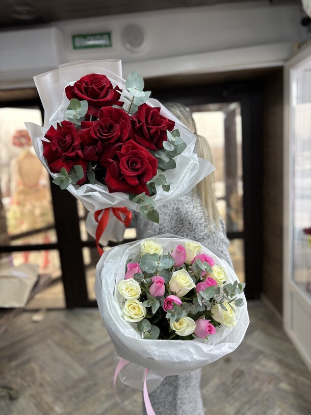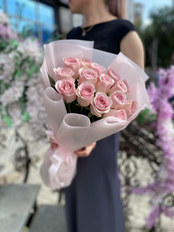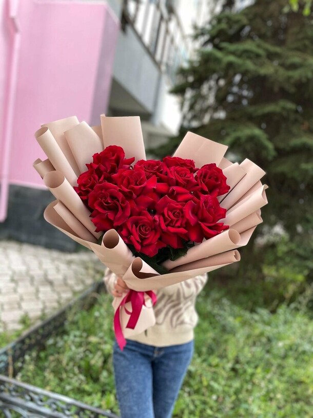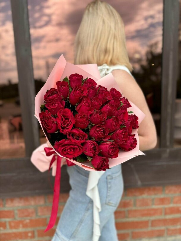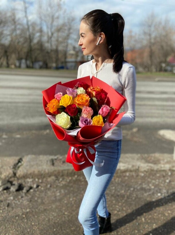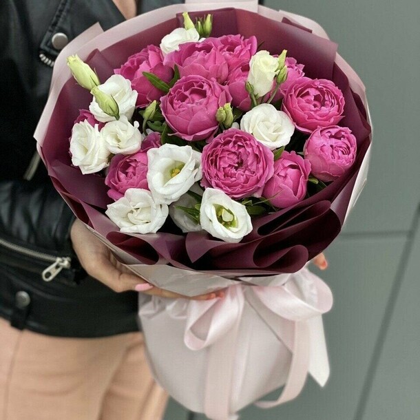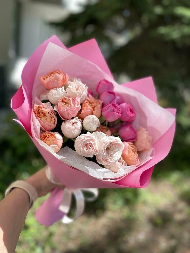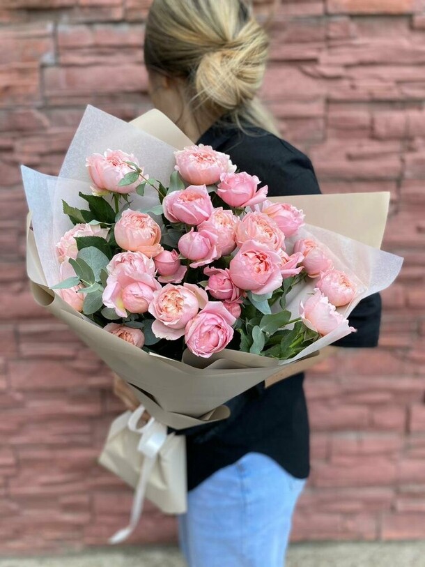 На фото в букете пионовидные розы, по факту обычные розы другого сорта