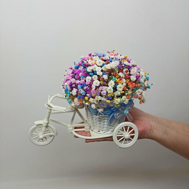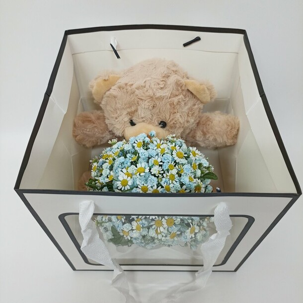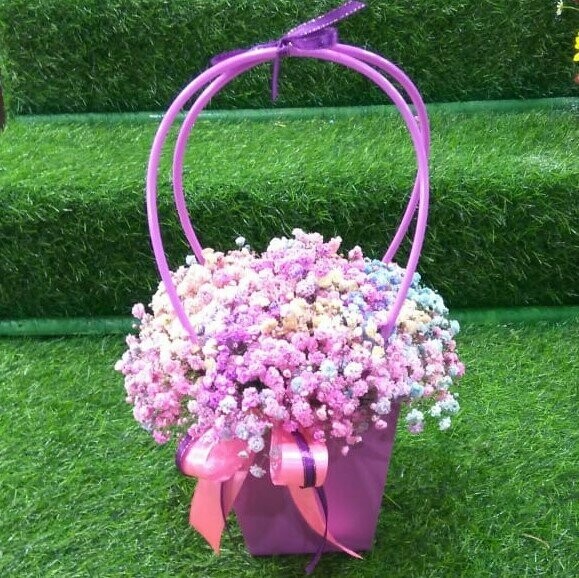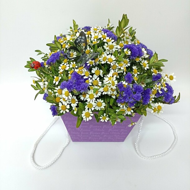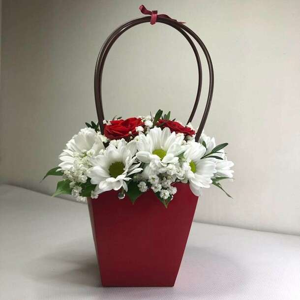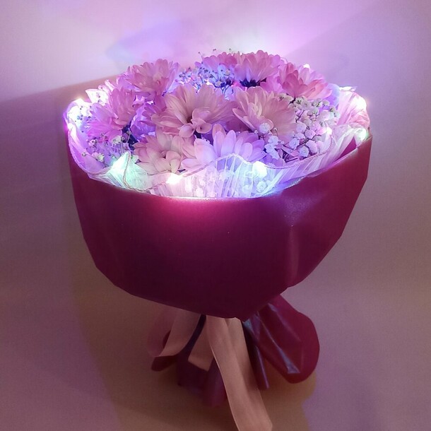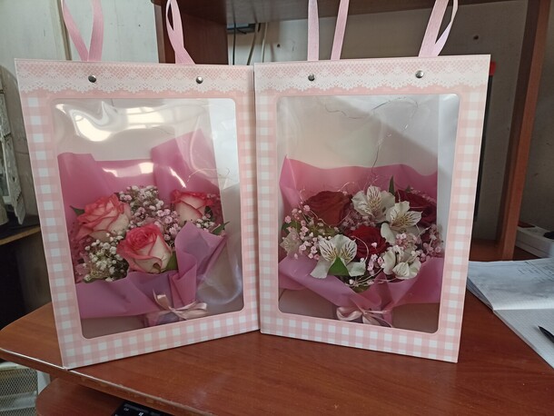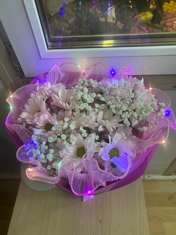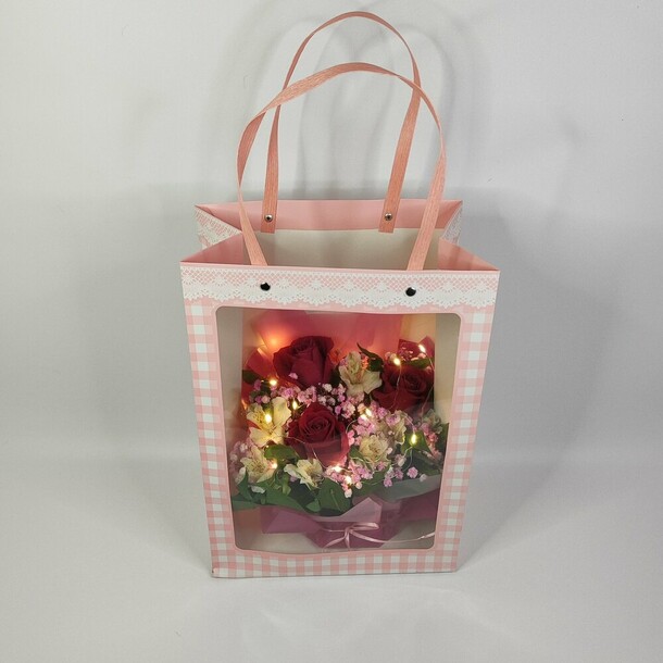 Цветы свежие, сумочка достаточно прочная, а светодиодная гирлянда готова к работе (батарейки покупать не потребовалось). Выглядит очень эффектно и празднично!