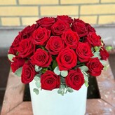 Композиция в шляпной коробке с розами и гипсофилой, клубникой, голубикой и шоколадными конфетами