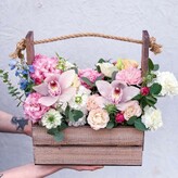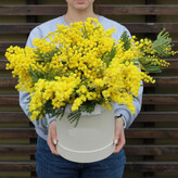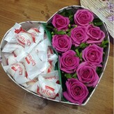 Композиция в шляпной коробке из хризантем и раффаэлло