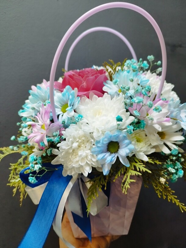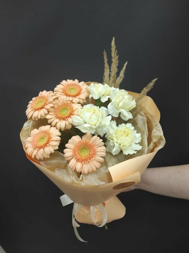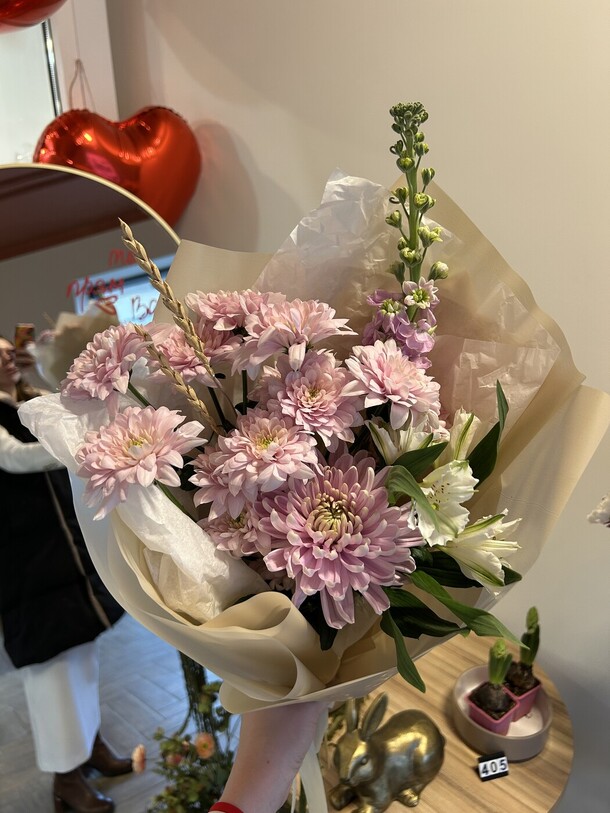 Быстро приняли заказ и сделали букет. Получился как на фото, очень милый. Доставка вовремя