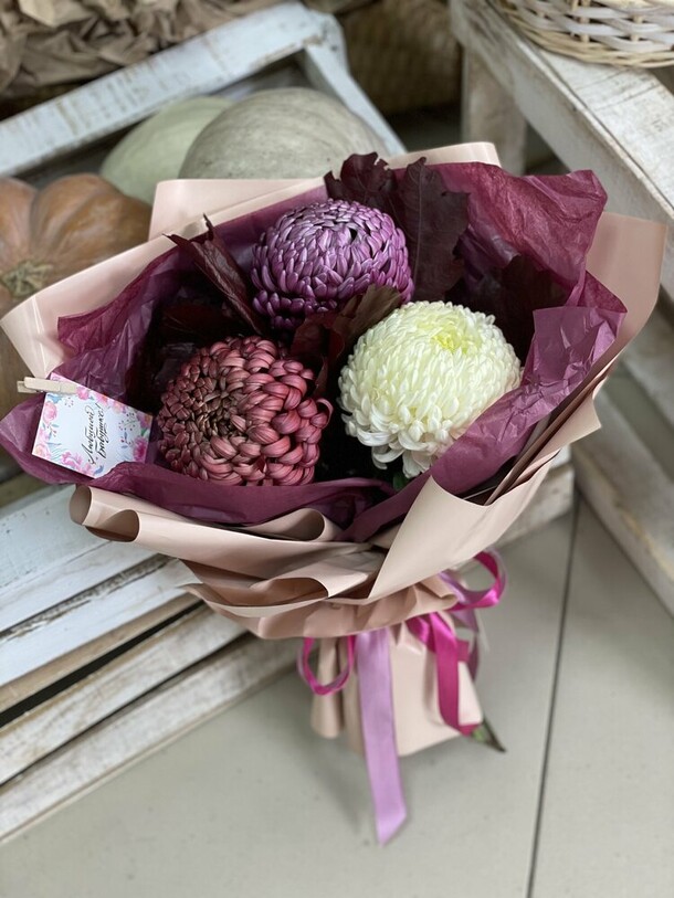 Очень красивый букет, доставлен вовремя. Обратимся обязательно ещё не раз в этот салон цветов