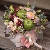 Не соответствие заявленному на фото. Курьер вез цветы без упаковки- замерзли.