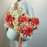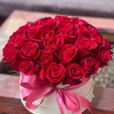 Композиция в шляпной коробке с розами и гипсофилой, клубникой, голубикой и шоколадными конфетами