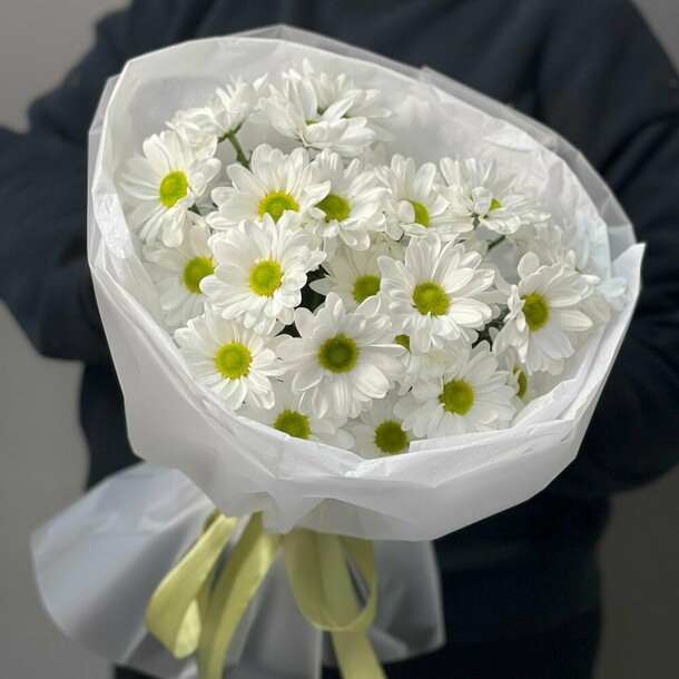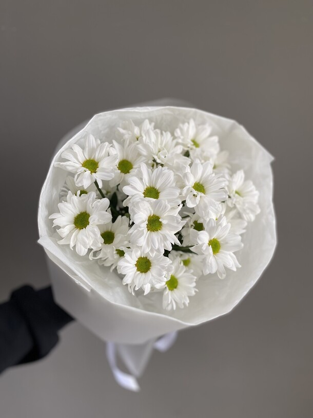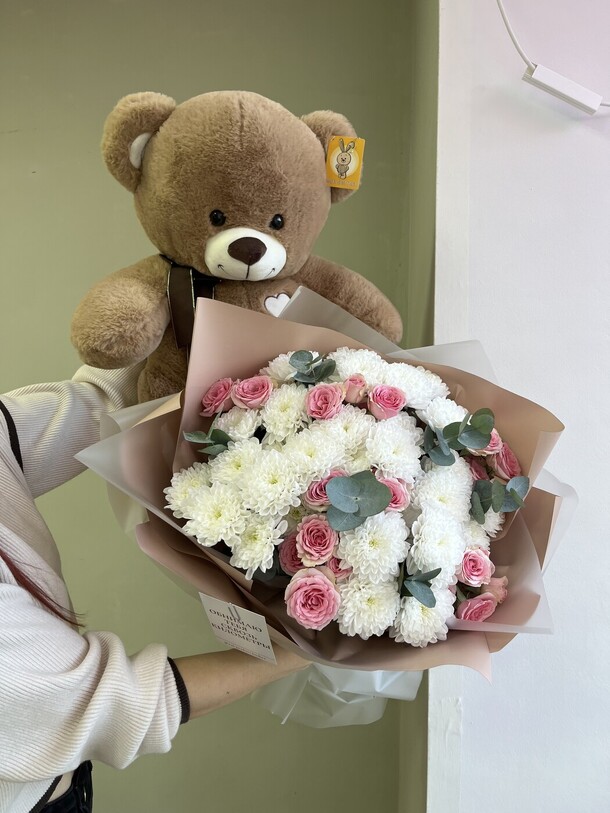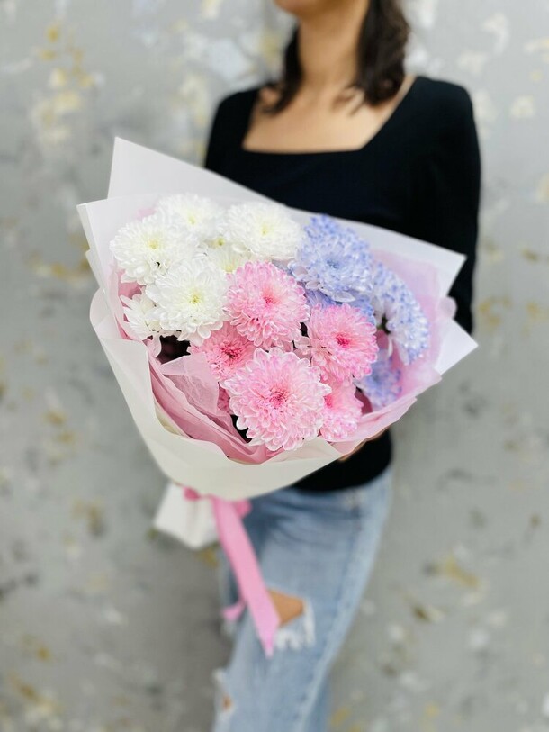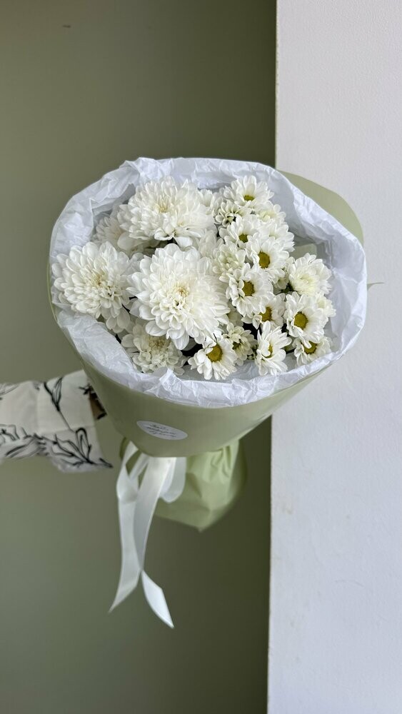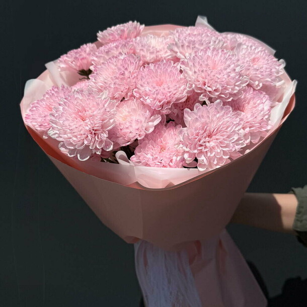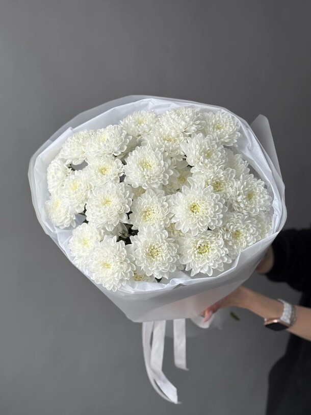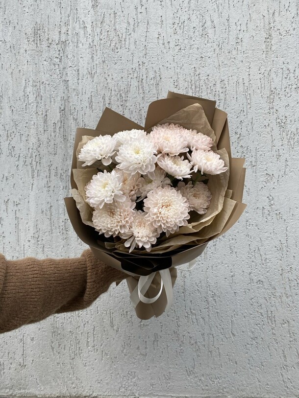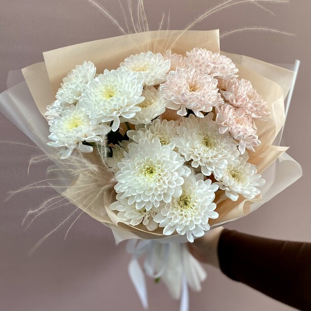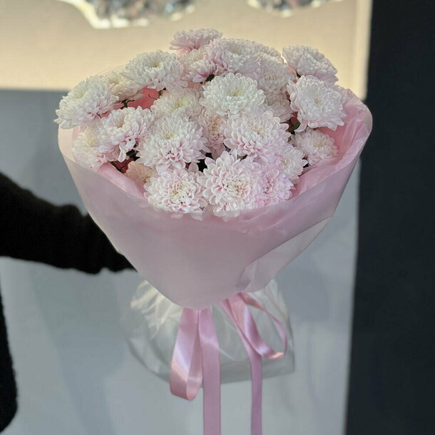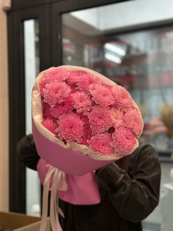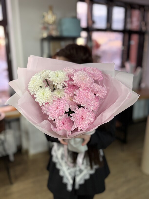 Букет был не круглой формы а овальной, хризантемы располагались кучей по середине что создавало не очень привлекательный вид. Благо есть опыт работы флористом и заказ оформила заблаговременно, переделала его сама.