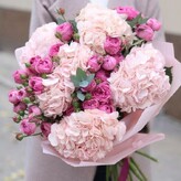 Букет из гортензии, нежных гвоздик и пионовидных кустовых роз