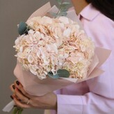 Букет из 3 нежных гортензий с эвкалиптом в упаковке