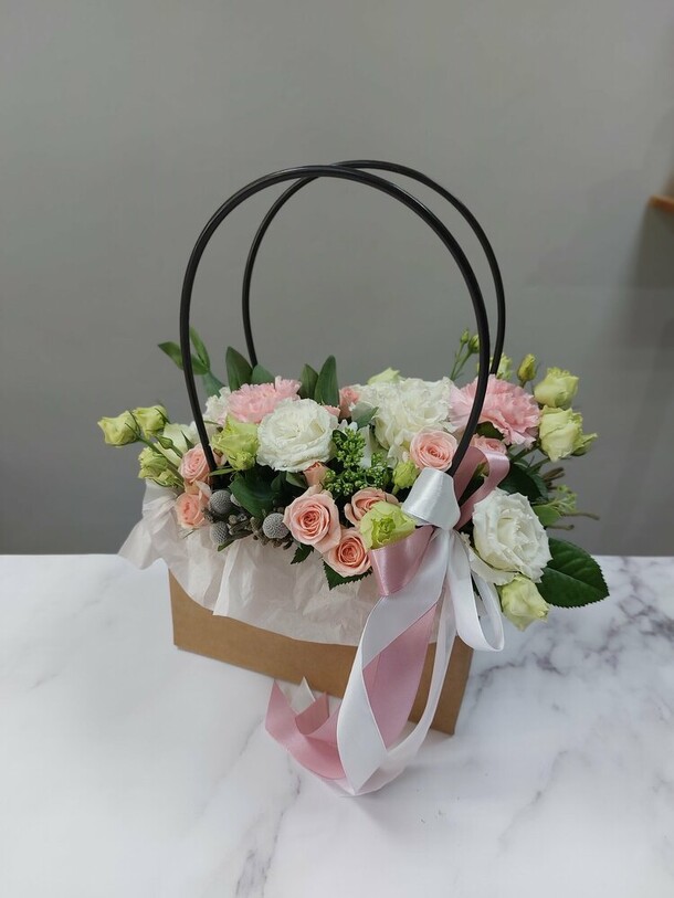 Букет собран из других цветов, чем те которые были заявлены. Но получилось красиво и в схожей цветовой гамме.