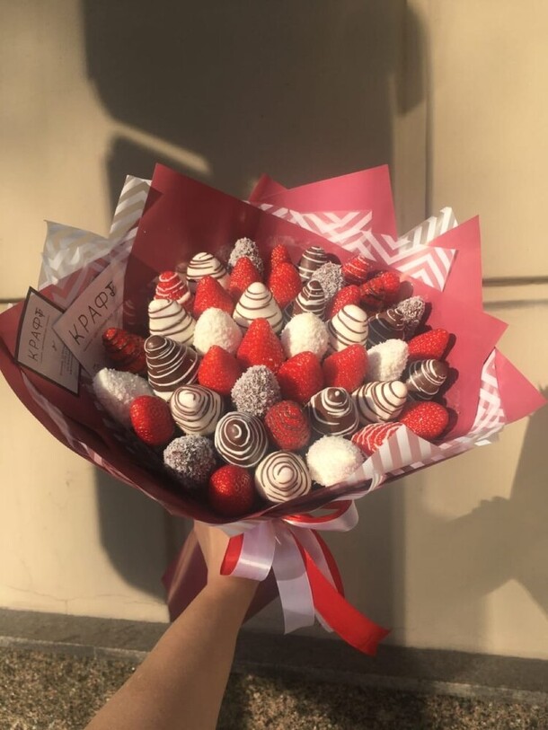 Клубника отличного качества, но зеленоватая, некоторые клубнички прям наполовину зелёные были. Шоколад вкусный. упаковка великолепна. флорист в чате оперативно отвечал.