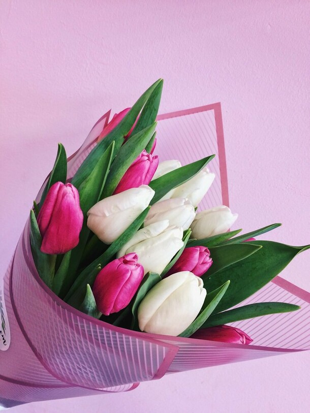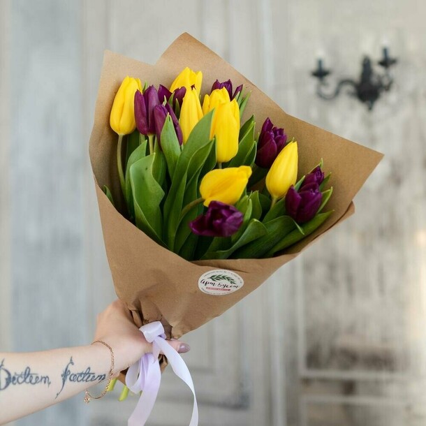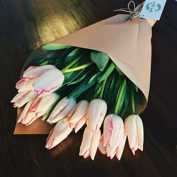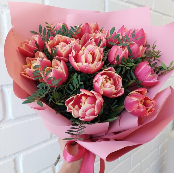 Тюльпаны с некрупными бутонами и цвет немного отличается, вместо розовых добавили бело-розовые. Из плюсов цветы свежие, обернули в плёнку для защиты от холода. Спасибо!