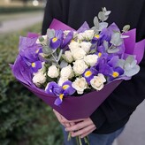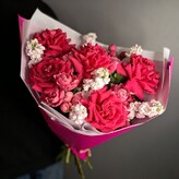Нежный авторский букет с пионовидными розами, хризантемой ньютон и диантусами